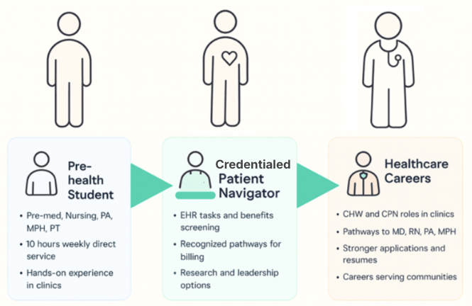 We train students to become credentialed Patient Navigators skilled in the competencies and knowledge base through a Centers for Medicare & Medicaid Services (CMS)-approved curriculum grounded in national standards for community health integration and supervised, hands-on practice, often under the guidance of clinical professionals. These navigators are auxiliary clinical personnel who can complete defined tasks within the electronic medical records systems, screen and coordinate benefit applications and enrollment, manage documentation, and track outcomes. For students, this is far more than a one-semester stint. It offers a bridge into health careers: some go on to physical therapy, medical, nursing, or physical therapy programs; others are hired directly into community health-worker or navigator roles. Our aim is to widen the pipeline of skilled staff without lowering the bar for care.